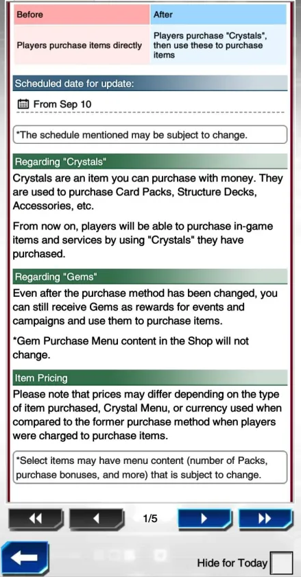 Instead of directly purchasing an item with money, Duel Links will now require players to purchase Crystals to buy pay-for items.
