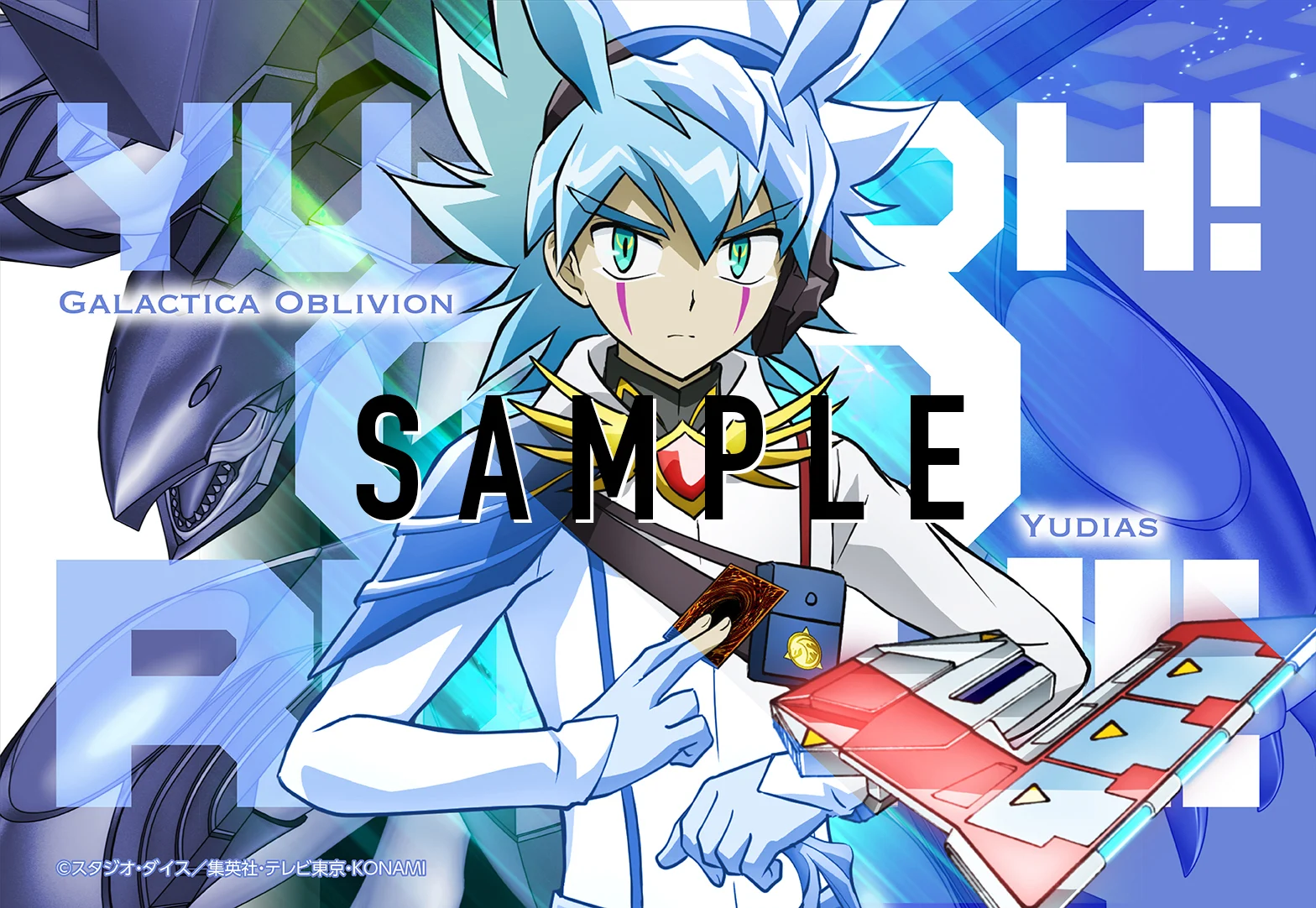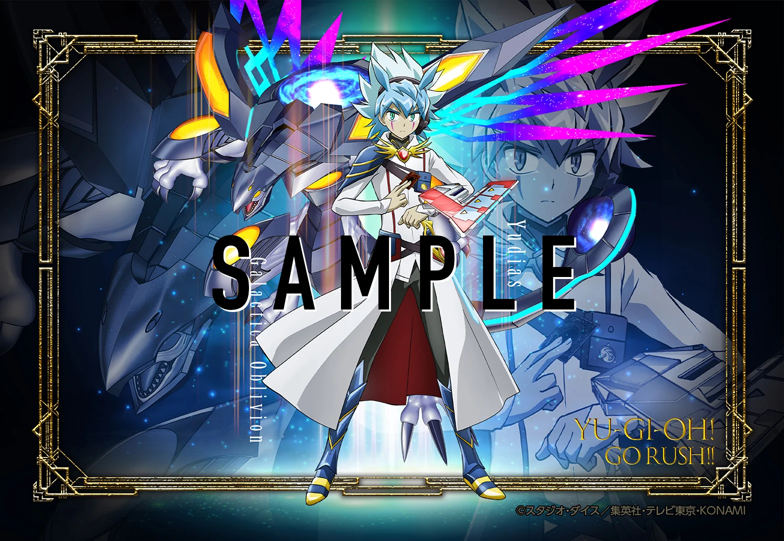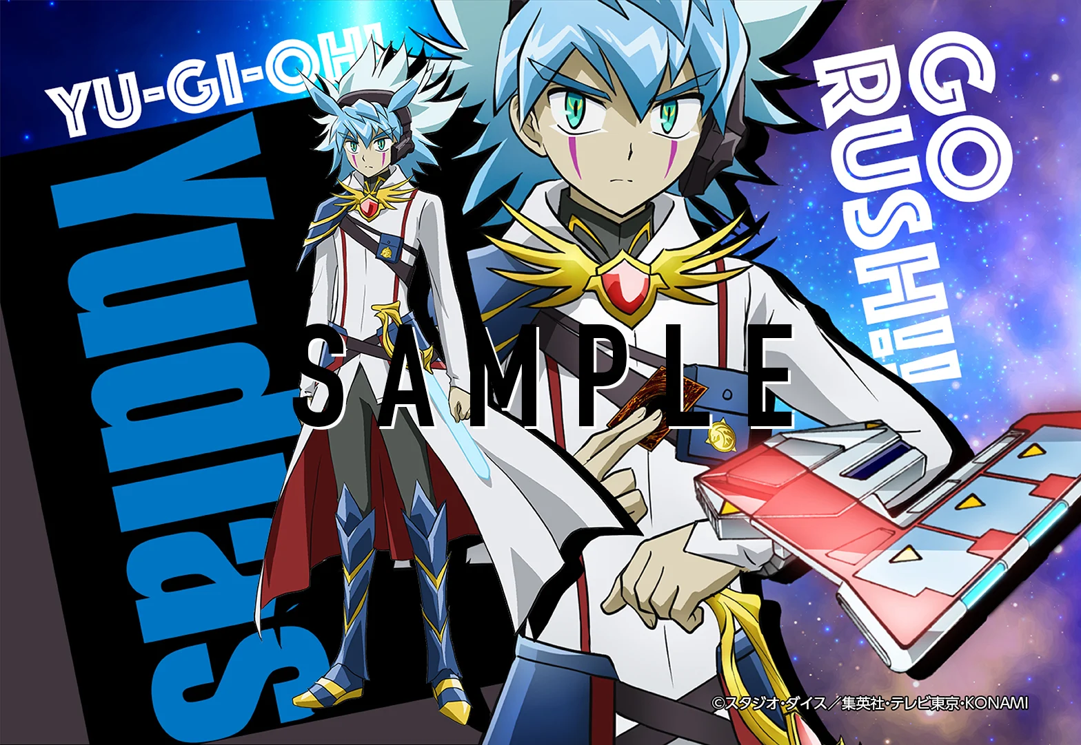 In addition, Yudias Velgear from Yu-Gi-Oh! GO RUSH!! is featured on three posters in the vein of the posters of the other seven protagonists, along with his ace monster Galactica Oblivion: