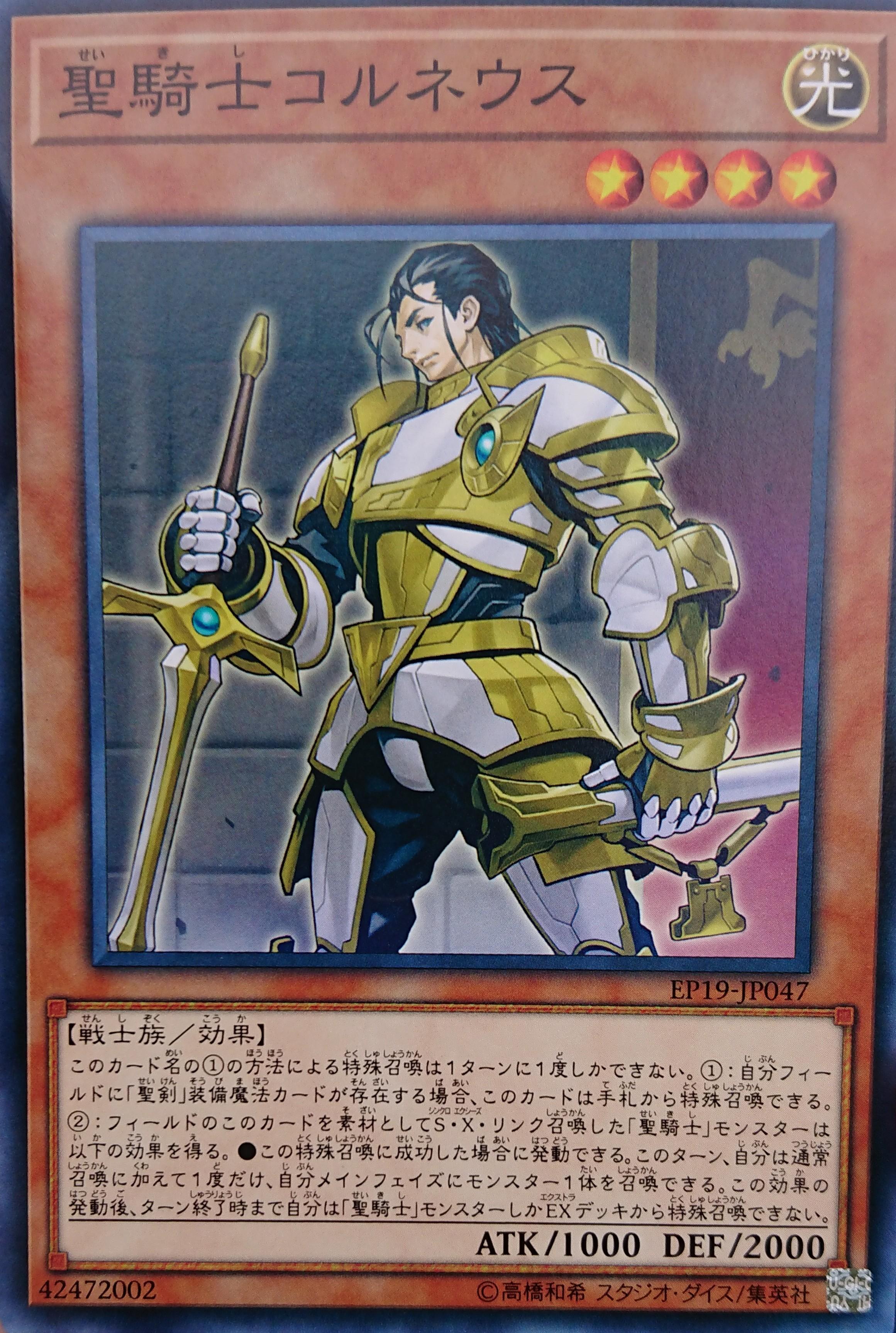 • この特殊召喚に成功した場合に発動できる。このターン、自分は通常召喚に加えて1度だけ、自分メインフェイズにモンスター1体を召喚できる。この効果の発動後、ターン終了時まで自分は「聖騎士」モンスターしかEXデッキから特殊召喚できない。