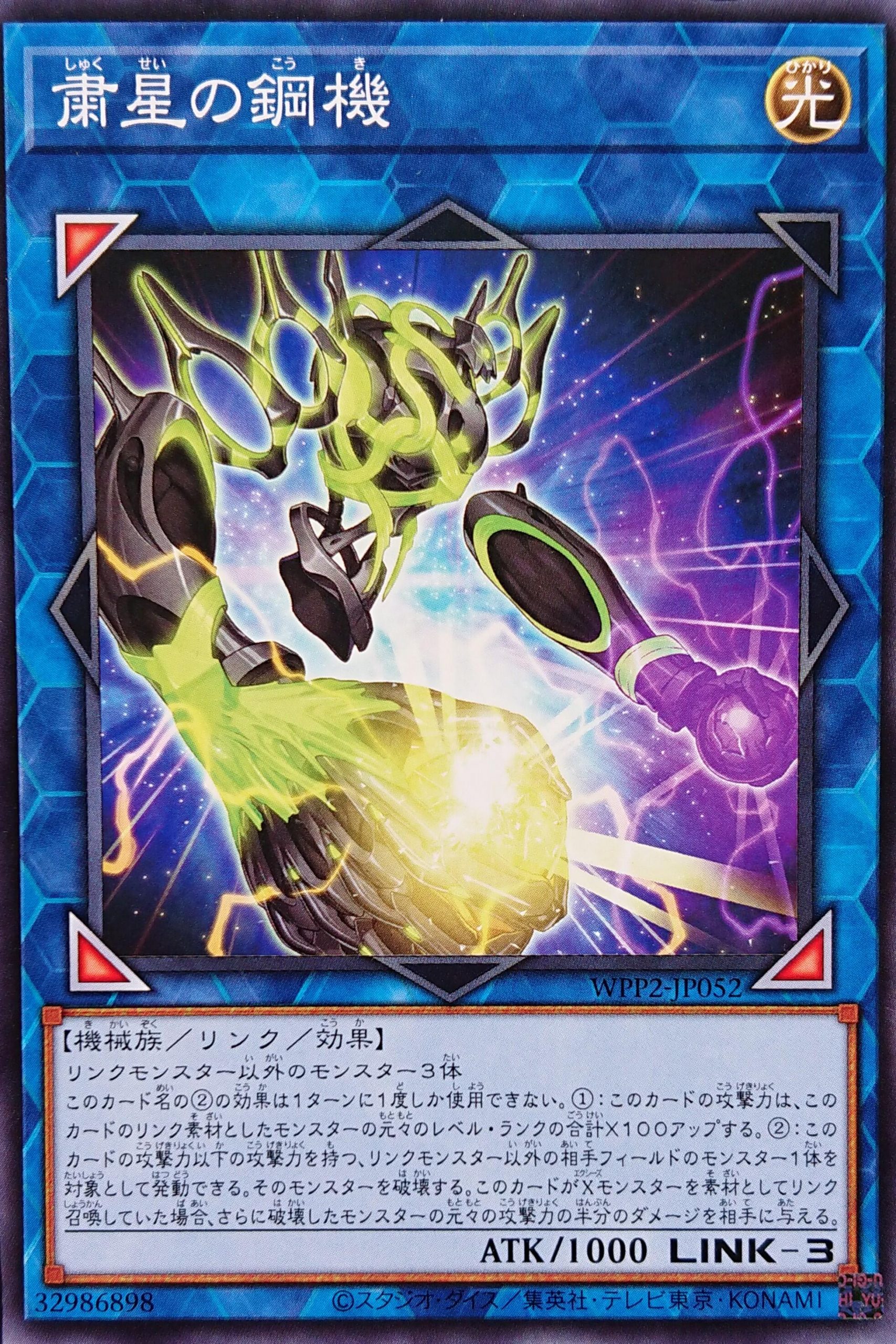 Note: This card’s name is 粛星 (Regulation + Star) and Steel Machine souds like “Law and Order/Discipline”.