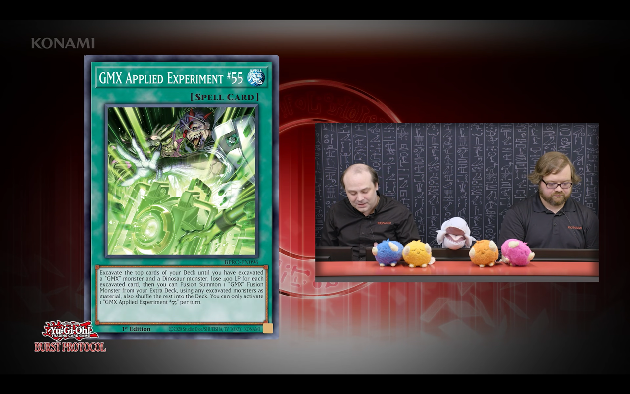 Excavate the top cards of your Deck until you have excavated a “GMX” monster and a Dinosaur monster, lose 400 LP for each excavated card, then you can Fusion Summon 1 “GMX” Fusion Monster from your Extra Deck, using any excavated monsters as material, also shuffle the rest into the Deck. You can only activate 1 “GMX Applied Experiment #55” per turn.